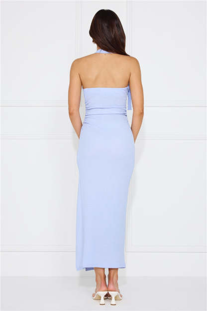 For a sophisticated 'fit. style the Songs Of The Sea Halter Midi Dress. Featuring a halterneck design. a buckle adjusting halter strap and a textured fabrication. Style with heels for all the likes.