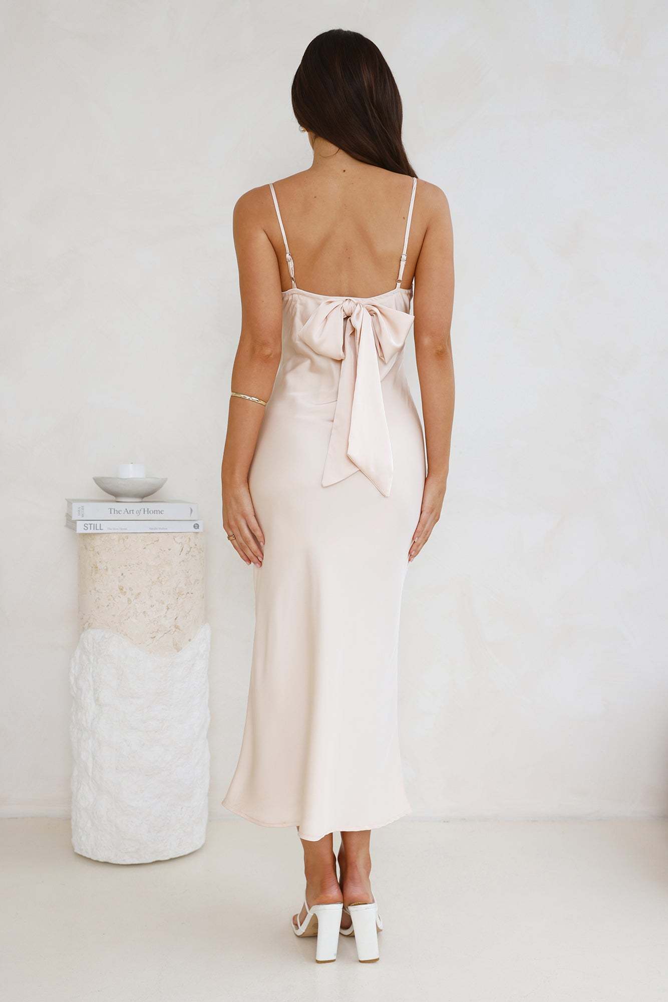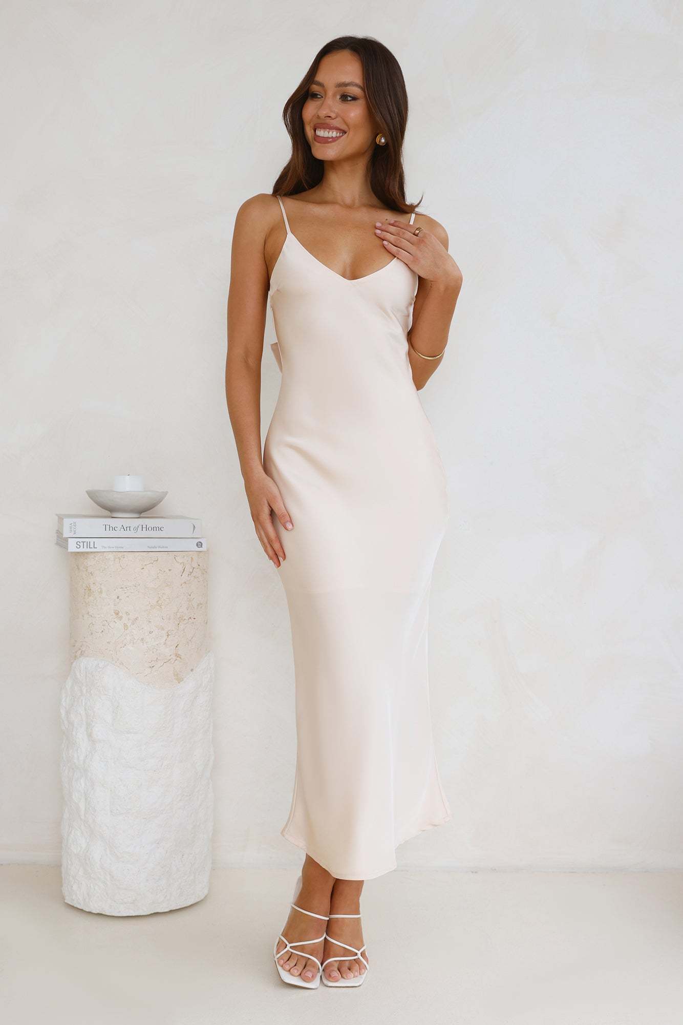 Designed for classy affairs. The Sophisticated Satin Slip Midi Dress features a gorgeous silky satin silhouette. a V-neck and a tie-up detail to the back. For a timeless 'fit style with heels.
