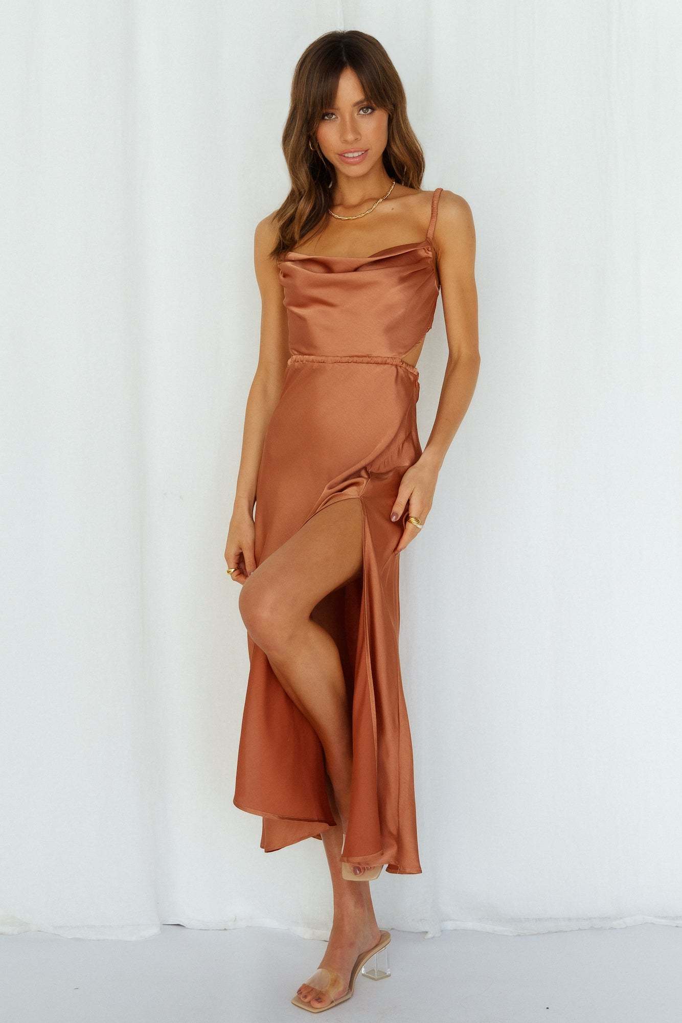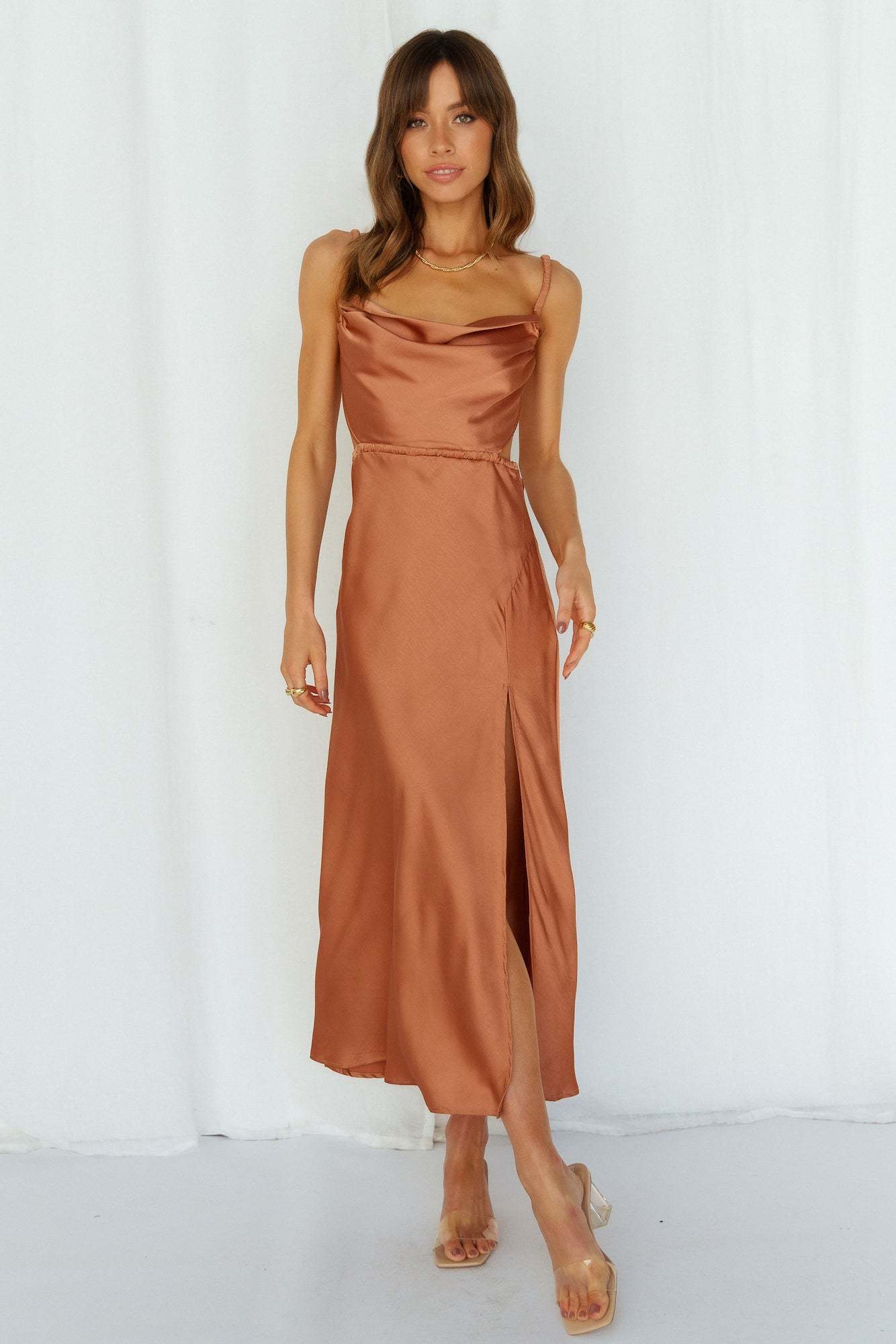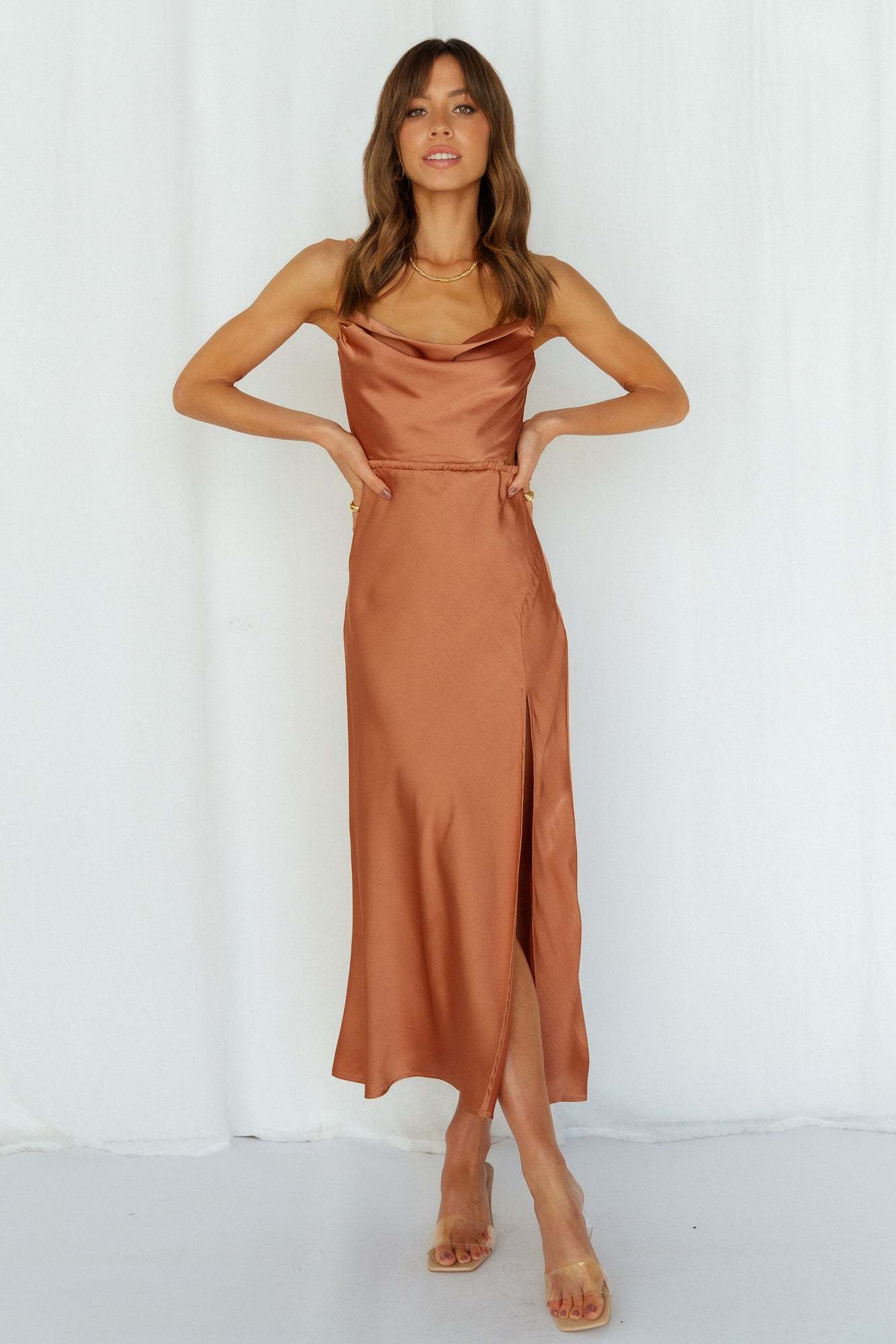 - Rust midi dress.