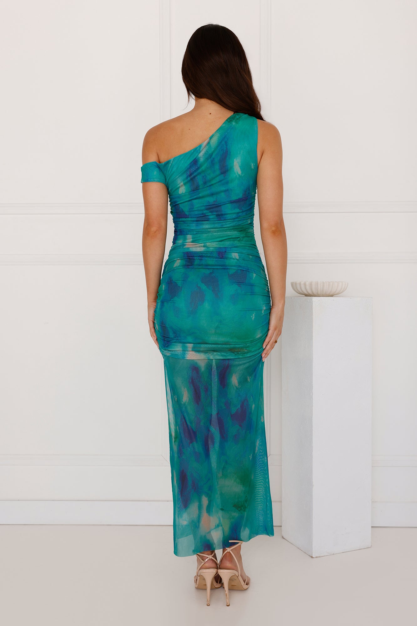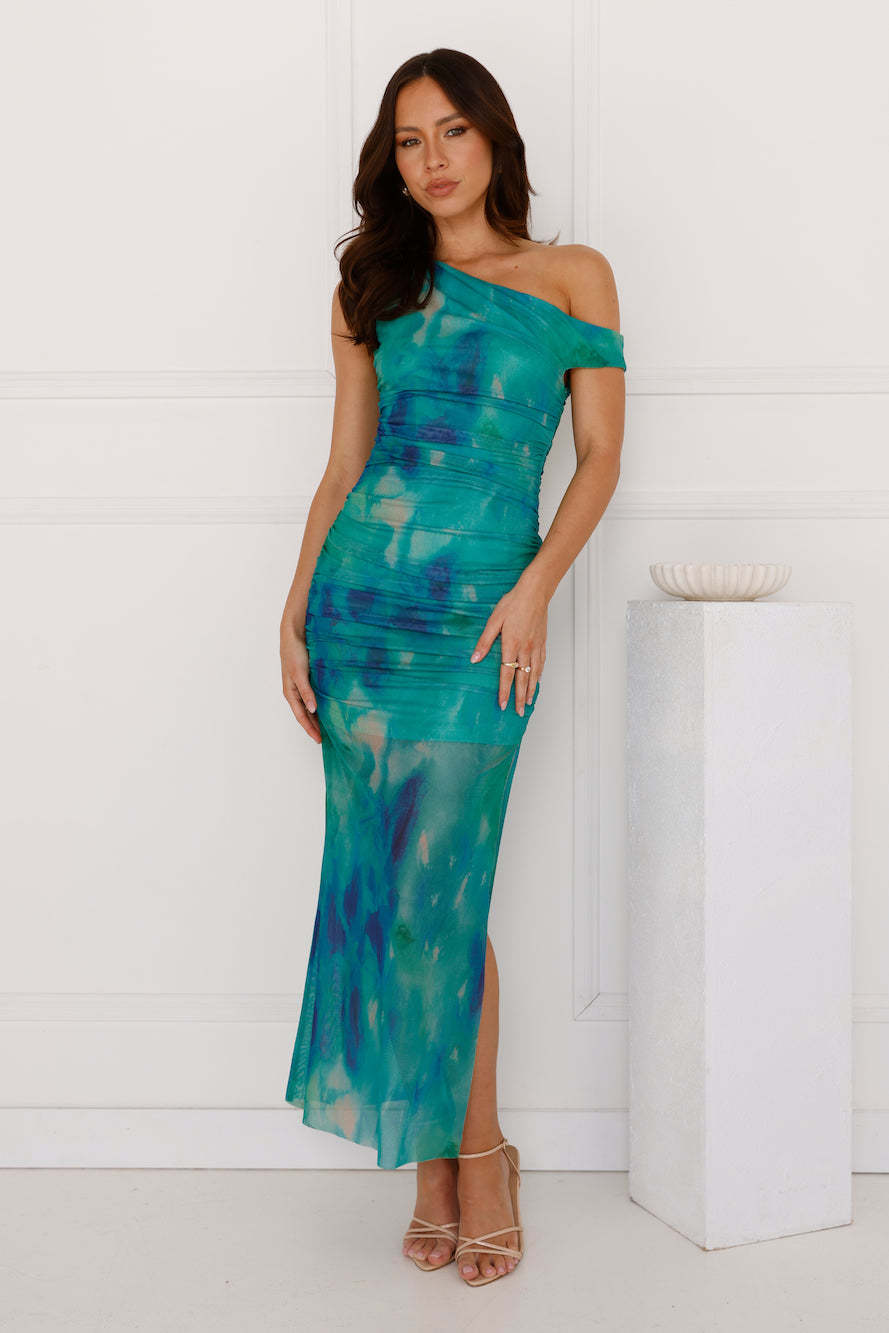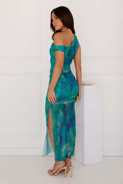 Stories Of Sophistication Off Shoulder Mesh Maxi Dress Green