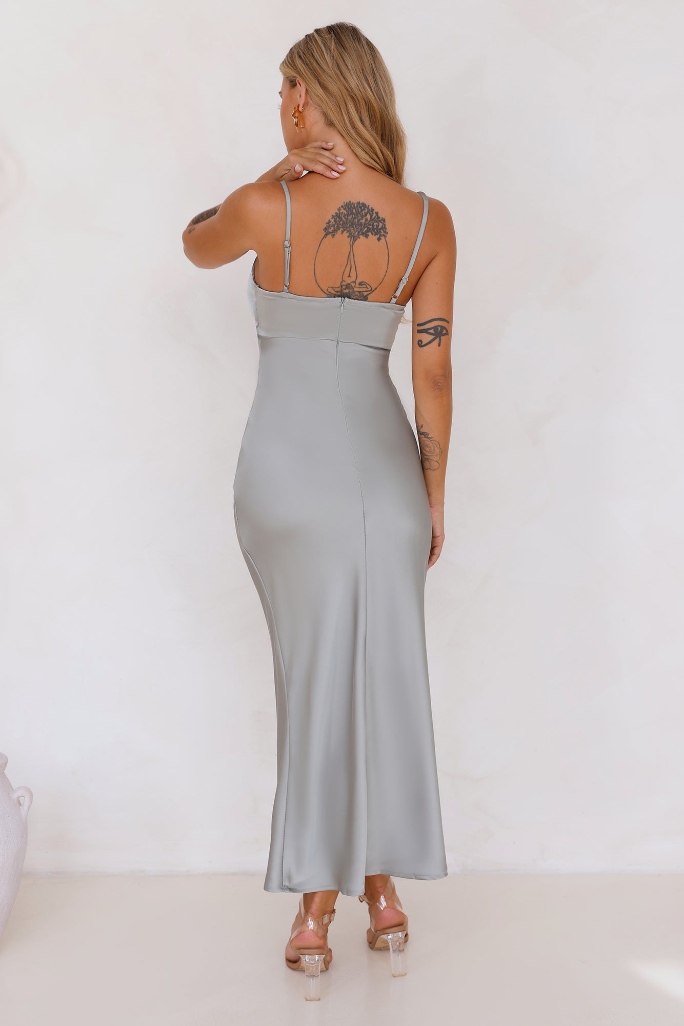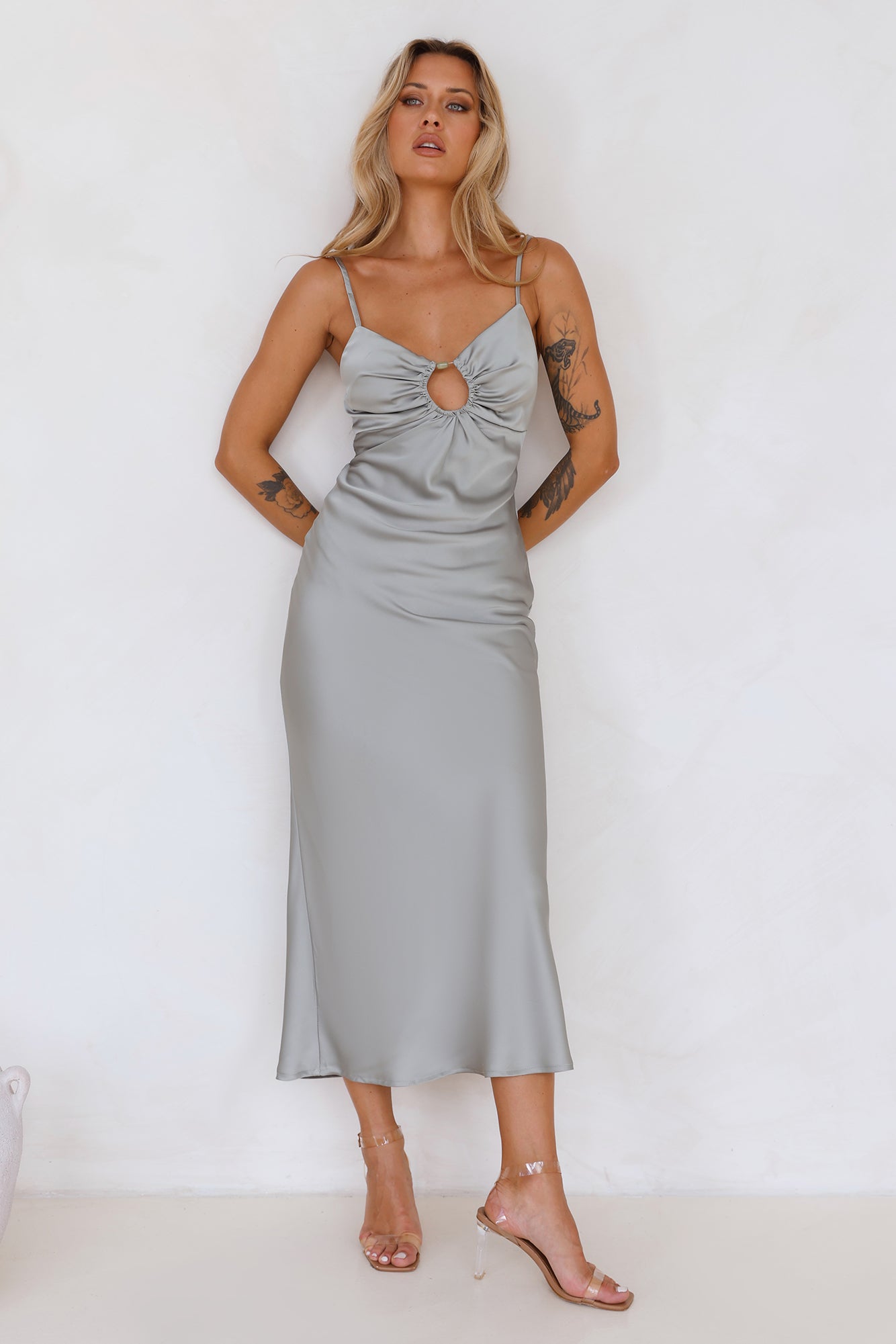 Get ready to feel amazing in the Style Compass Satin Midi Dress. Featuring a silky satin silhouette. a bead detail to the neckline and a straight. flowy fit. Style with heels for all the love.