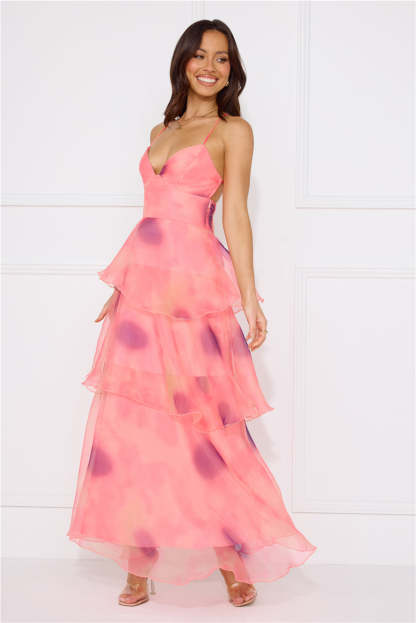 Enter the event and impress! The Summer Destination Maxi Dress features an extravagant tiered flowy skirt and a crisscross back design. Style with heels and curls for all the attention.