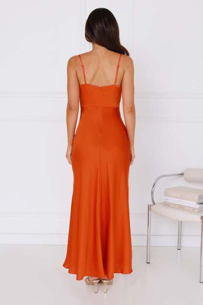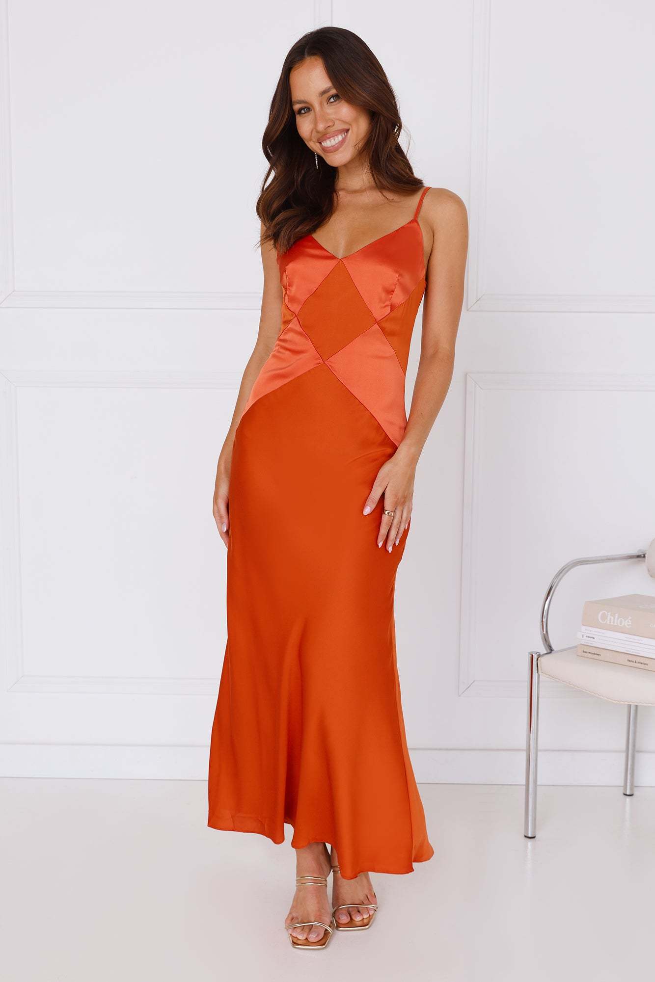 Embrace your love for slip dresses with the Sunburst Citrus Satin Maxi Dress. Featuring a straight. flowy silhouette with a V-neckline and a detailed bodice. Style with heels for a 'fit we love.