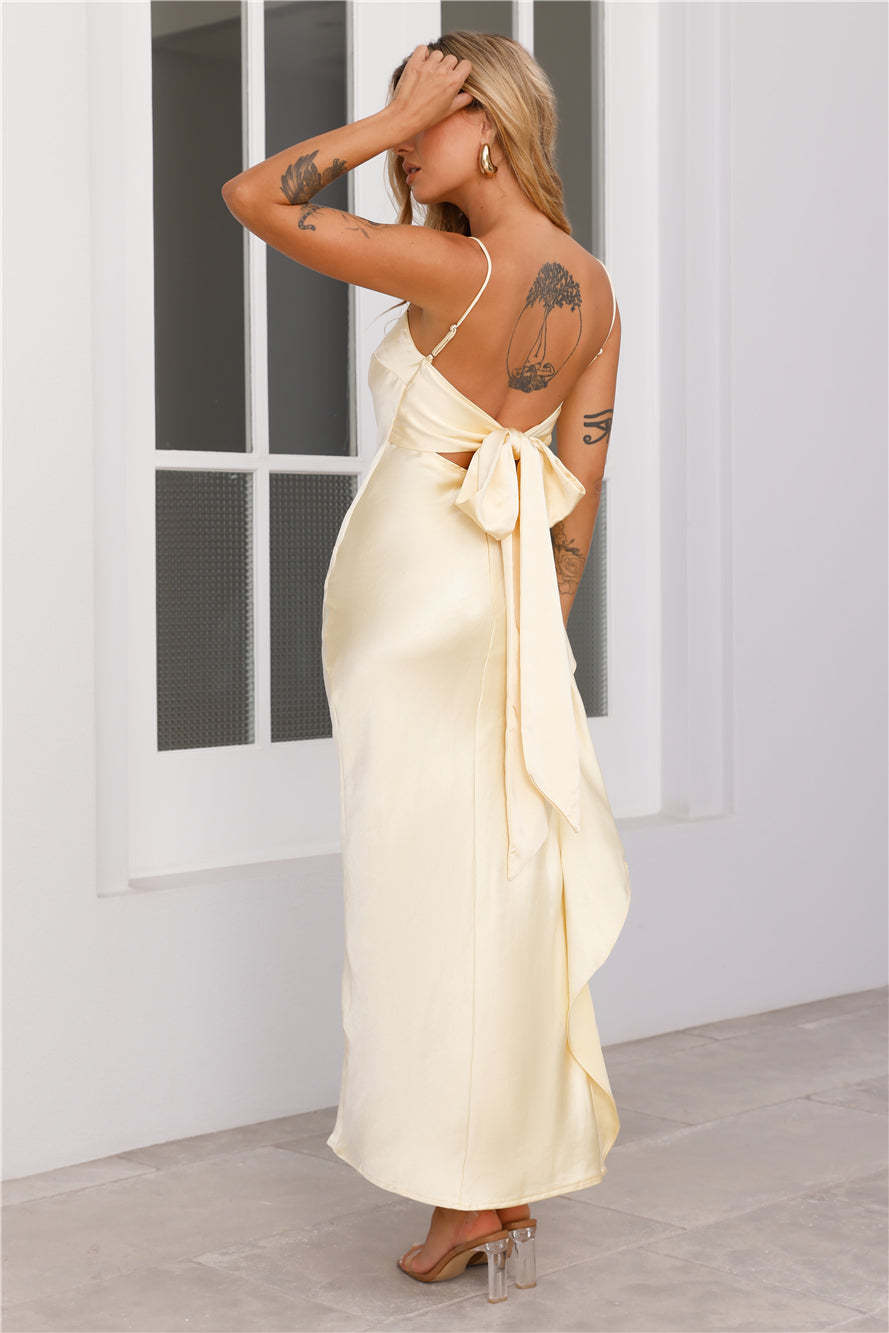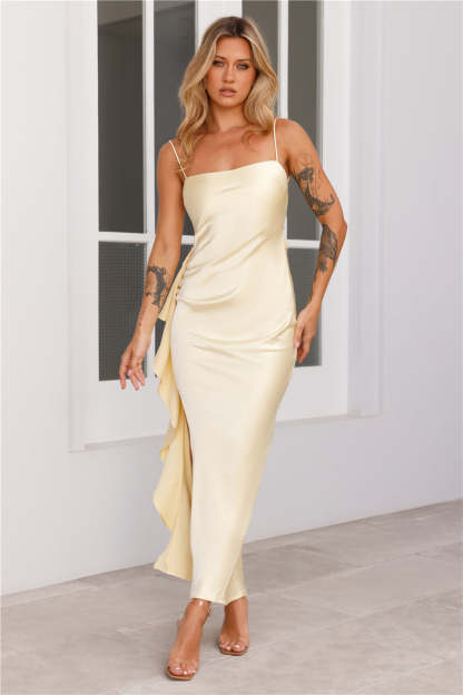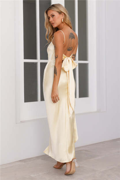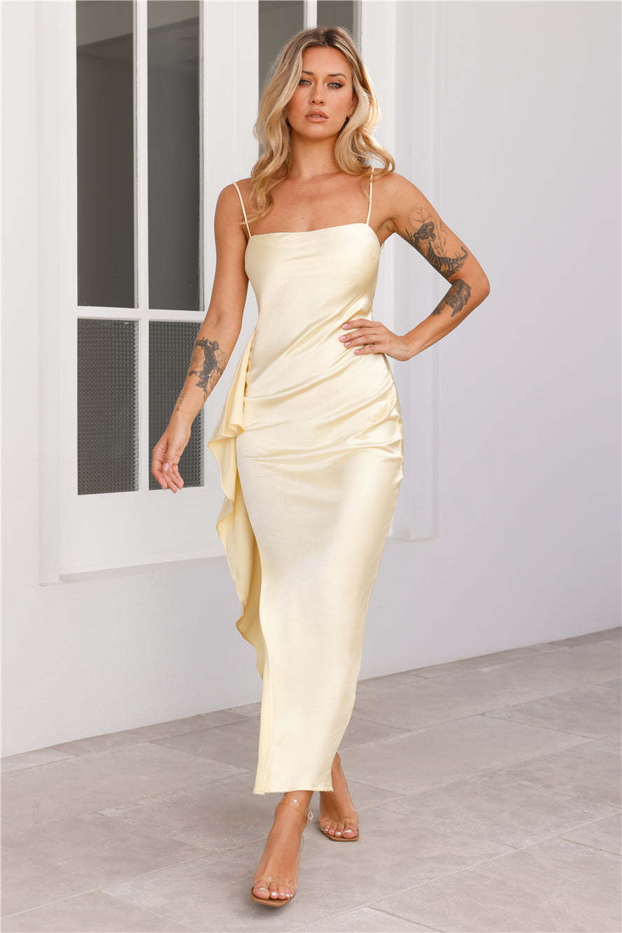 A classy dress for your fancy affairs. The Sweet Stories Satin Maxi Dress features a silky satin silhouette. a tie-up back and a frill train to the side with a split to the skirt. Style with heels to bring the 'fit together.