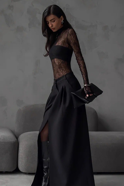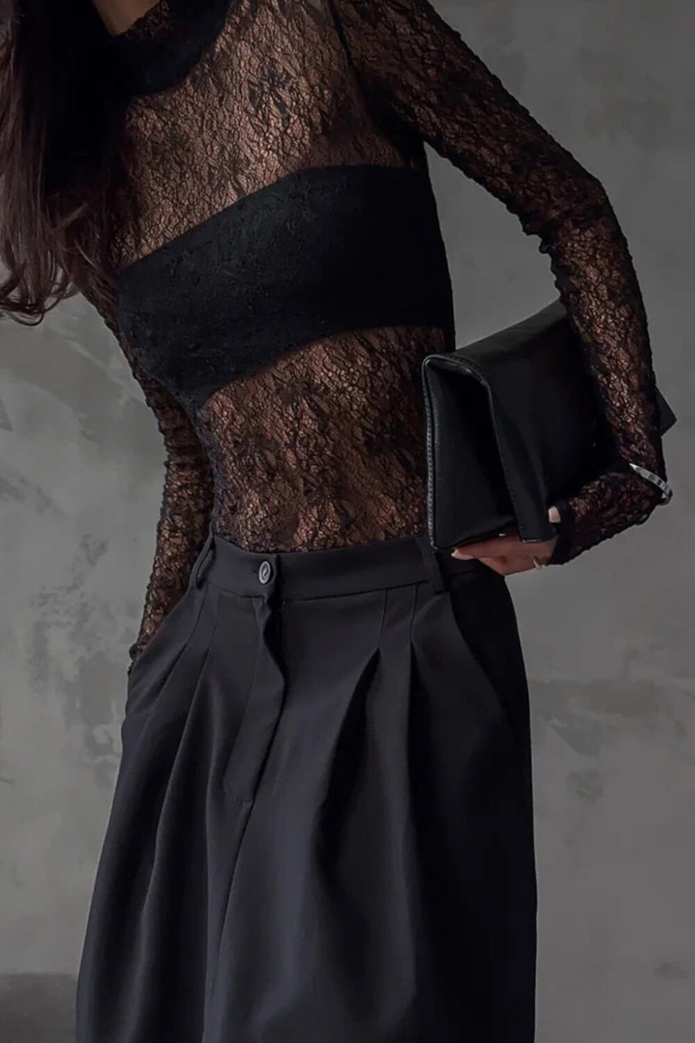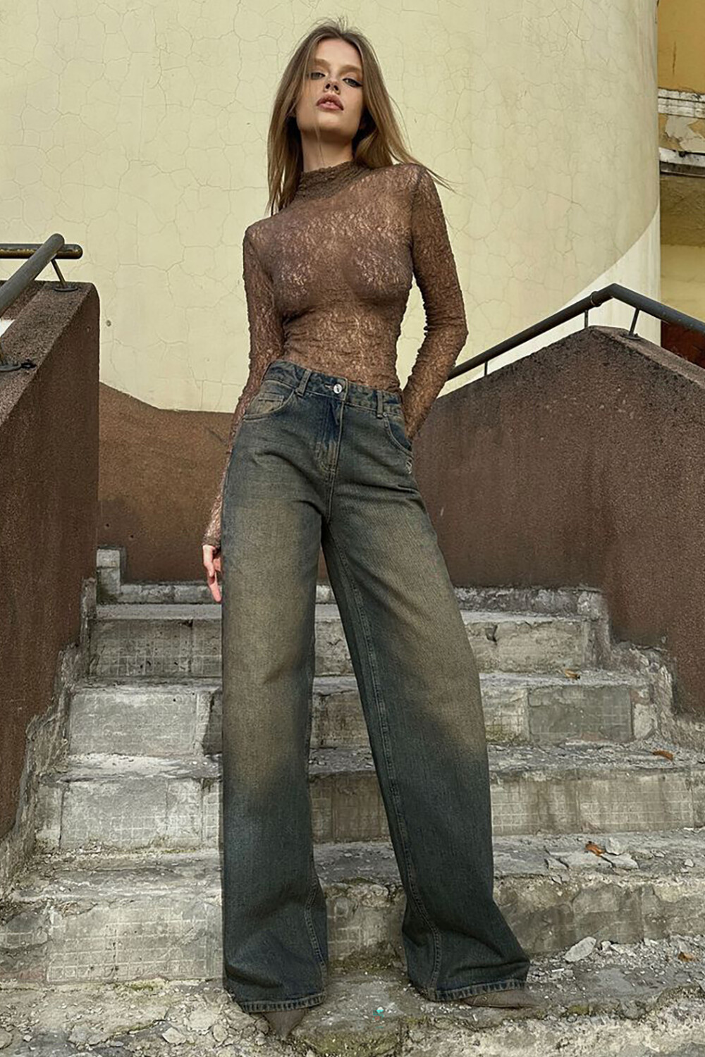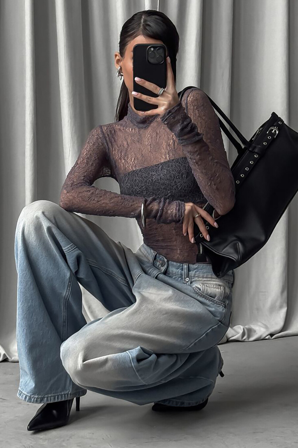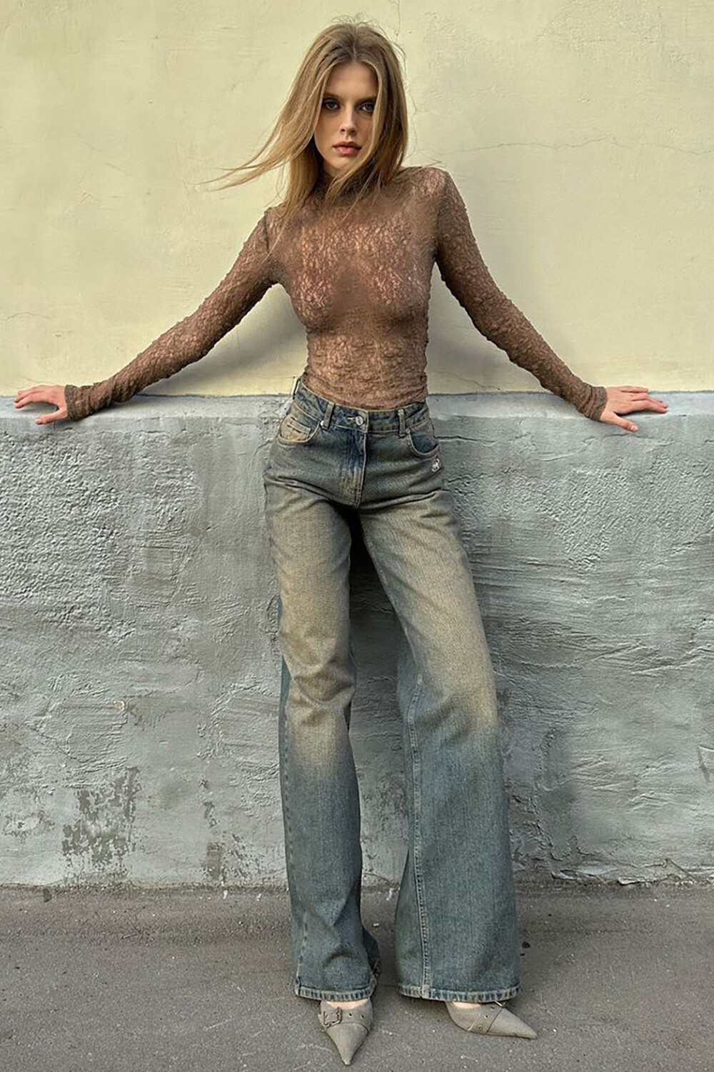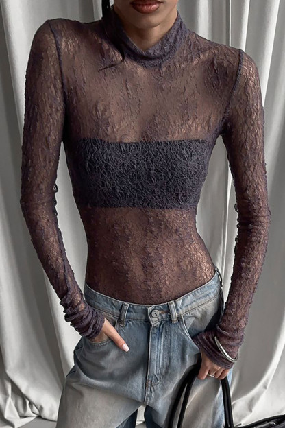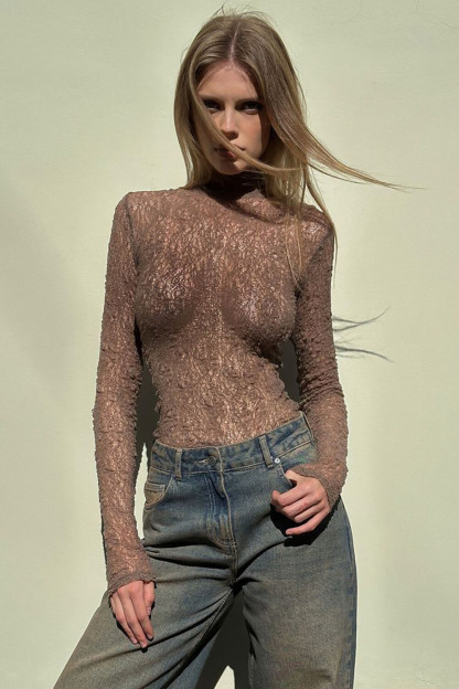 Textured Lace Stand Collar Long Sleeve See Through Top-Brown