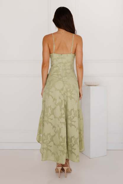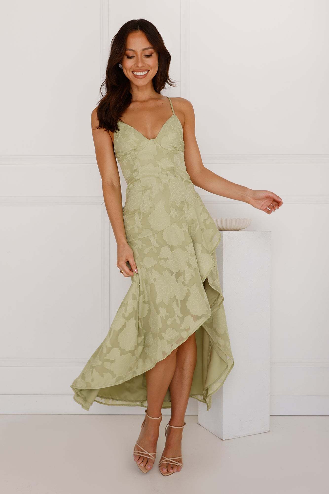 Stylish. timeless and perfect for your next party. The Touch Of Magic Midi Dress features a gorgeous asymmetric frill skirt. a pretty pattern to the fabrication and a dreamy green hue. Style with heels for all the attention.