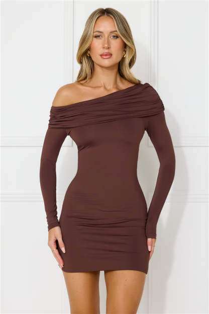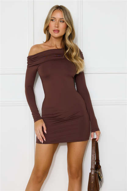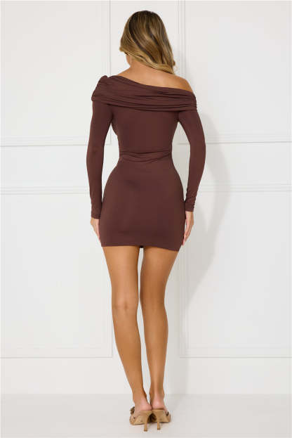 Urban Style Off Shoulder Long Sleeve Mini Dress Brown