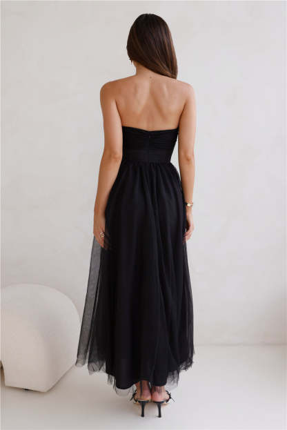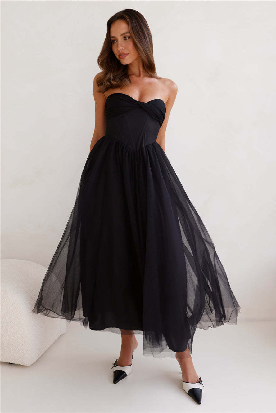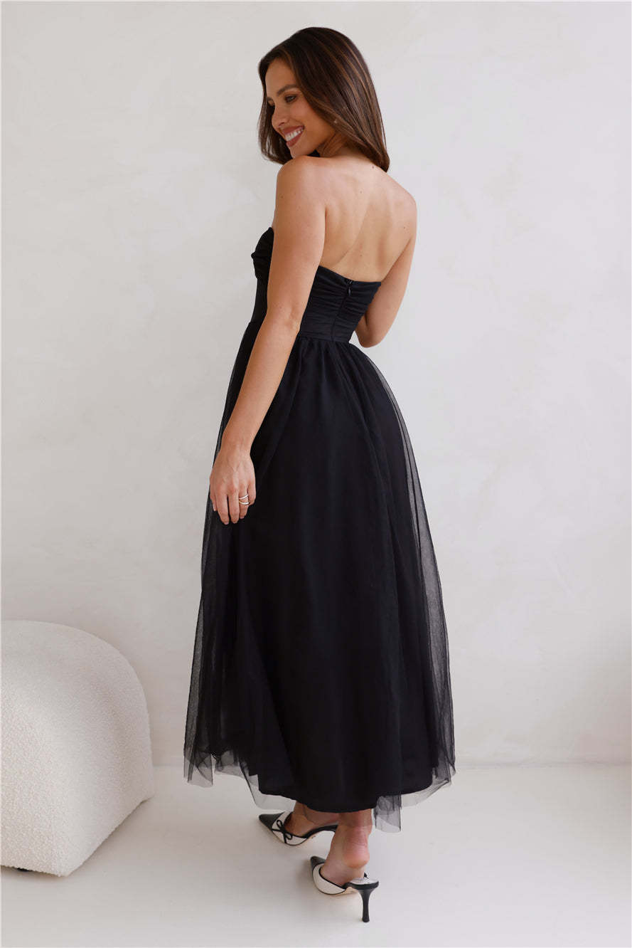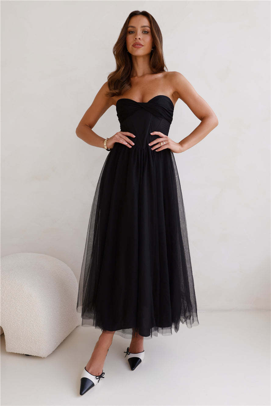 Worthy Of Diamonds Strapless Tulle Midi Dress Black