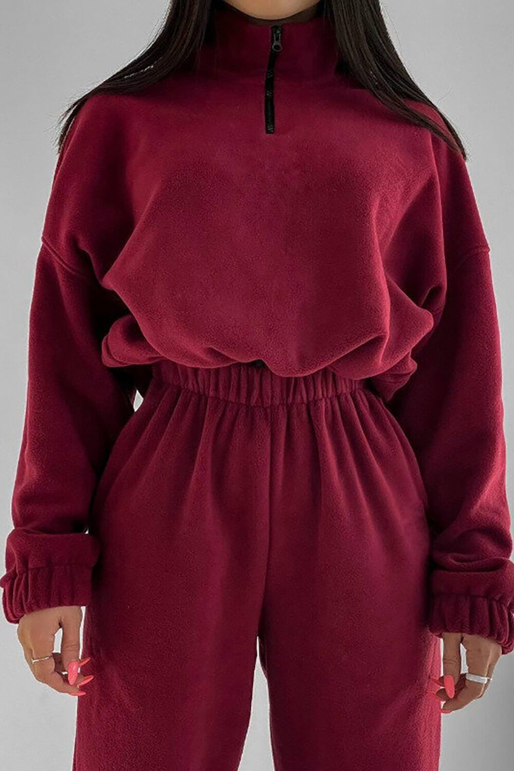 Zip Turndown Collar Crop Sweatshirt Plain Jogger Pants Casual 2pcs Set-White